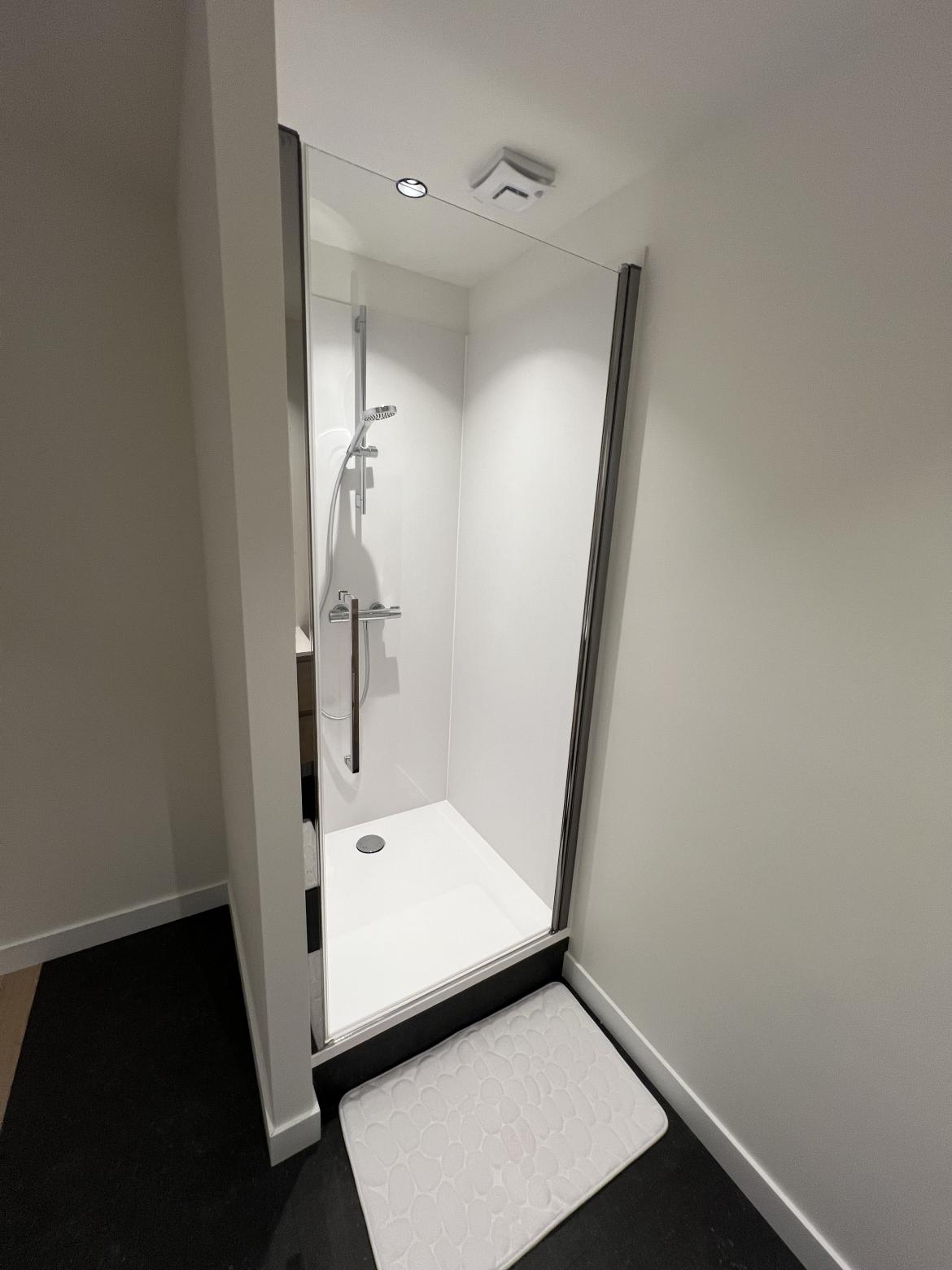 Totaalinrichting/totaalrenovatie Dit bestaand en verouderd kantoor hebben we omgebouwd tot appartement, hier werd een kamer met badkamer gecreëerd. Stijlwanden/ Valse plafond Binnendeur Gyprocwerken Douche + badkamermeubels Tegelwerken Plamuur en schilderwerken VOOR de werken